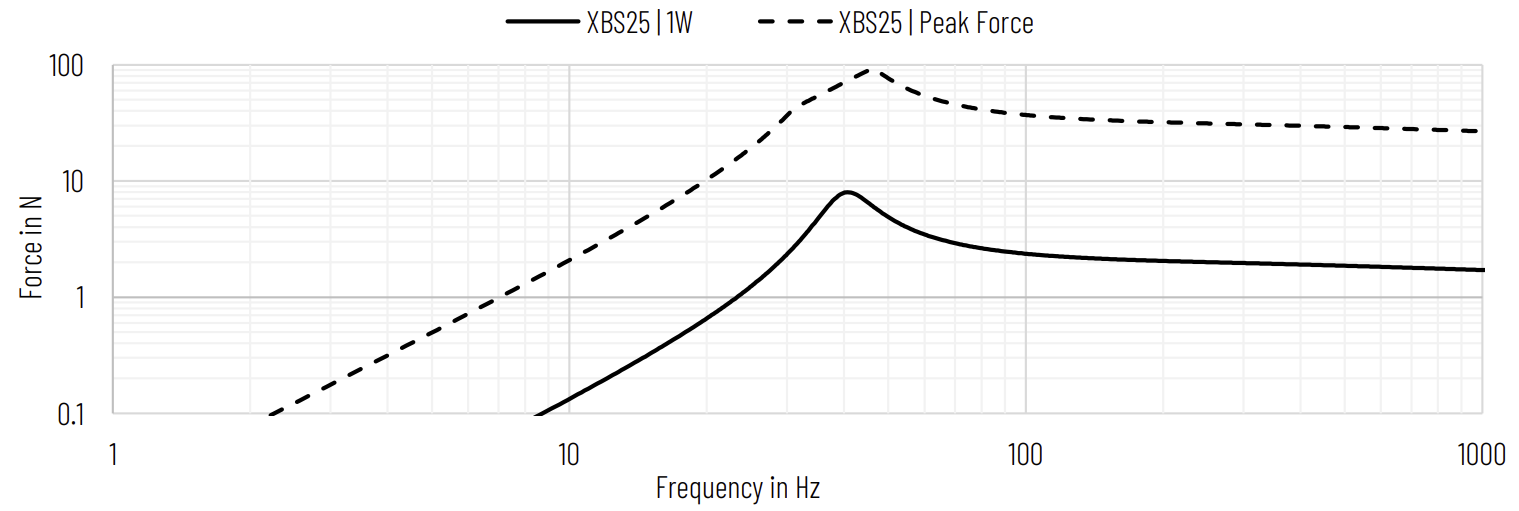 Don’t like choosing between power or size? We don’t either. The XBS25 eliminates that trade-off — delivering the full-force impact of a high-power bass shaker in just 30% of the volume. With 125W max power, ±6 mm excursion, and up to 93N peak force, the XBS25 produces low-frequency impact typically reserved for much larger, bulkier transducers| Long-term Max Power | 125 W |
